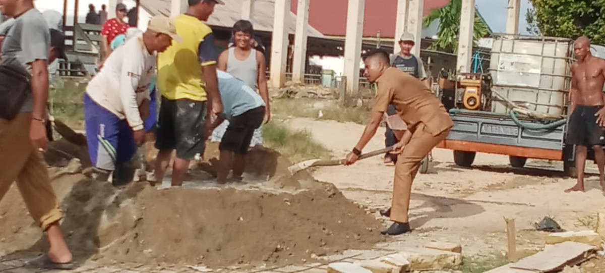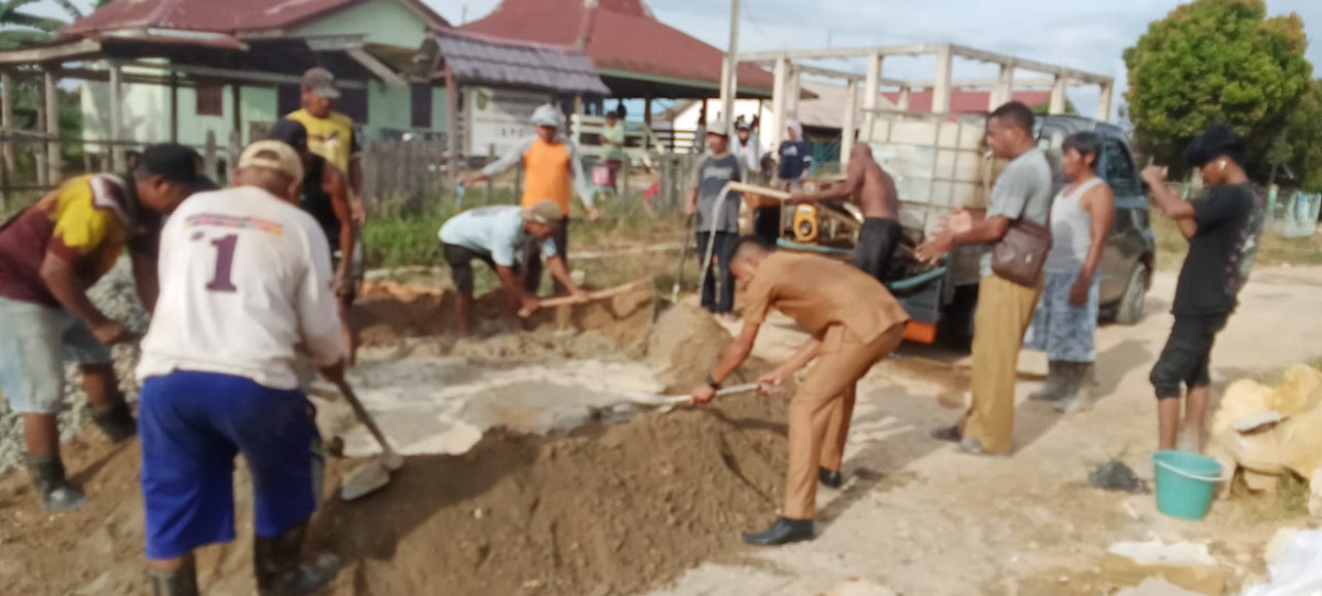 Mengunakan uang pribadi kepala desa bersama masyarakat bergotong royong menambal jalan yang berlobang